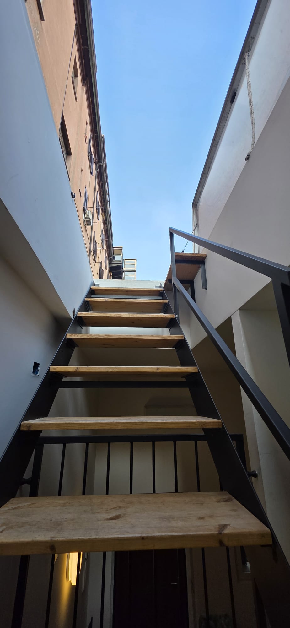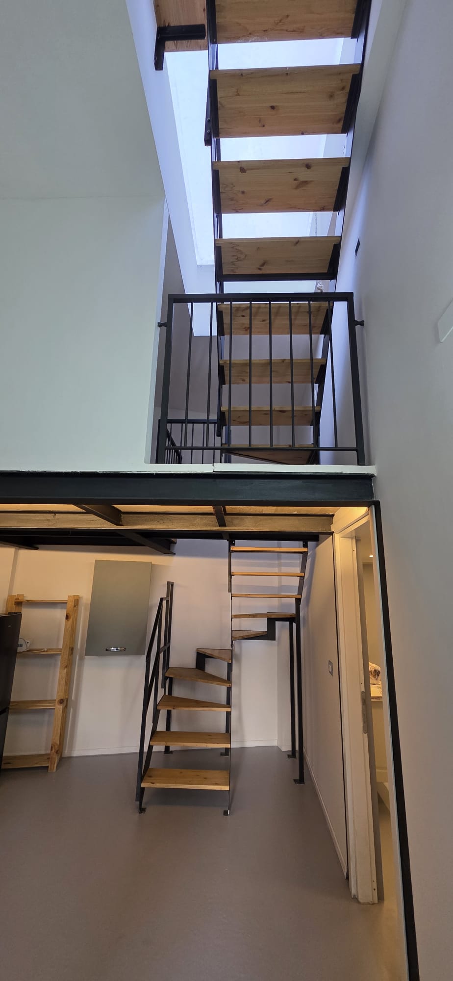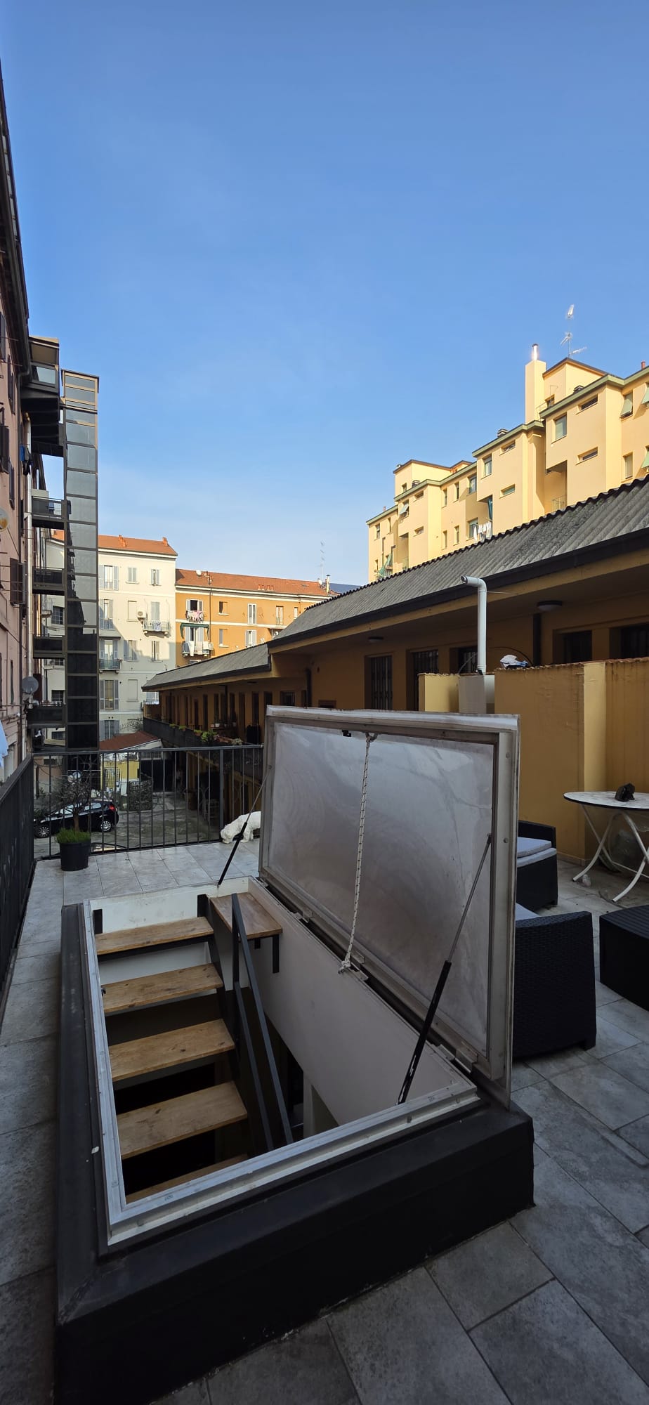 Lo spazio si articola su più livelli partendo dal piano terra, che ospita un luminoso soggiorno con cucina a vista, una camera da letto e un bagno finestrato. Un elegante soppalco adibito a ufficio funge da zona intermedia verso la splendida scala che conduce al terrazzo privato di 30 mq, una vera rarità urbana ideale per il relax all’aperto.