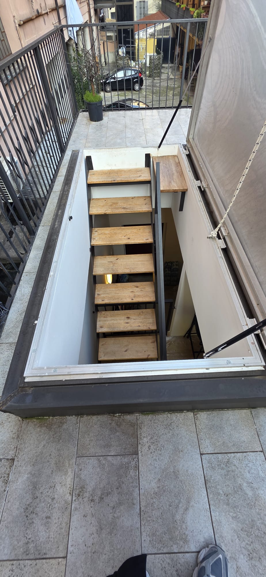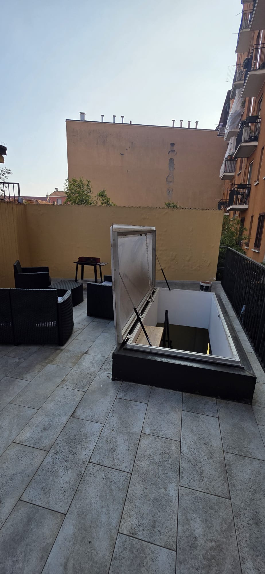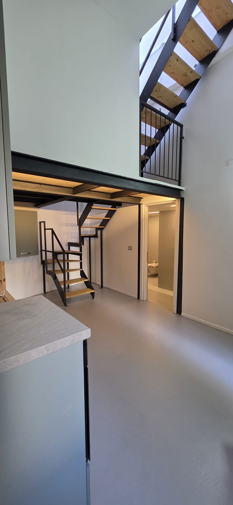 Lo spazio si articola su più livelli partendo dal piano terra, che ospita un luminoso soggiorno con cucina a vista, una camera da letto e un bagno finestrato. Un elegante soppalco adibito a ufficio funge da zona intermedia verso la splendida scala che conduce al terrazzo privato di 30 mq, una vera rarità urbana ideale per il relax all’aperto.